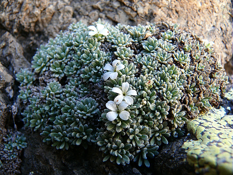 Plante naine, vivace, formant des petits coussinets, très denses et faiblement convexes. Les coussinets sont eux-mêmes formés de rameaux serrés les uns contre les autres, constitués de petites feuilles brunes et desséchées, en dessous d’une rosette terminale de feuilles vivantes. Les très nombreux poils étalés qui recouvrent pédicelles, calices et surtout feuilles rendent ces dernières blanches-grisâtres. Les fleurs solitaires au sommet des rameaux sont blanches cerclées de pourpre à la gorge.