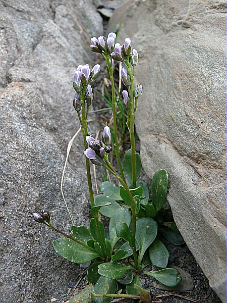 Espèce vivace de 3 à 10 cm de hauteur, glabre ou velue, formant de petites touffes à tige dressée simple. Feuilles épaisses ciliées, les basilaires obovales dentées et courtement pétiolées, les caulinaires une à trois, sessiles. Les petites fleurs bleu-pâle à pétales dressés de 3 à 5 mm produisent des siliques de 1 à 3 cm de long formant une grappe fructifère très courte. La graine brunâtre est largement ailée.