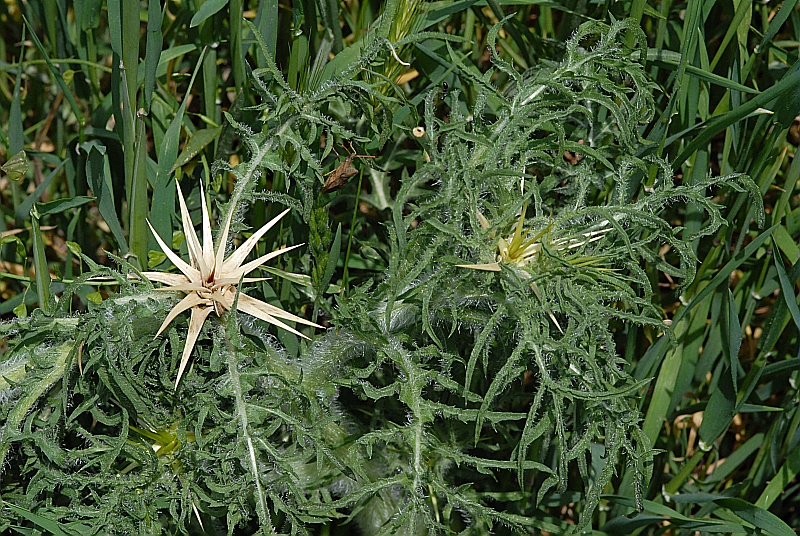 Plante bisannuelle, haute de 15 à 50 cm, dressée, rameuse à rameaux divariqués. Feuilles pennatiséquées, non décurrentes, divisions étroites, dentées-spinuleuses, les supérieures sessiles. Capitules solitaires, larges de 6 à 8 mm sur pédoncule court composés de fleurs lilas. Involucre ovoïde aux bractées terminées par une épine jaune atteignant 2 cm de long.