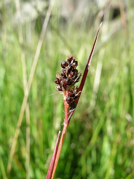Plante vivace, haute de 15 à 35 cm, sans stolons. Feuilles planes, linéaires-étroites. Inflorescence en ombelle dense dépassée par une feuille florale et composée de glomérules sessiles, dressés lors de la fructification, aux fleurs noires brunâtres. Anthères un peu plus longues que les filets. Capsule noire luisante.