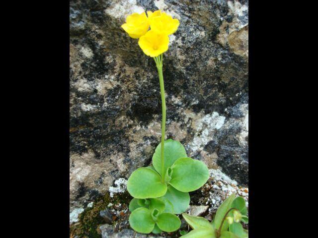 Très belle primevère, haute de 5 à 20 cm qui forme des touffes dans les rochers, dont les fleurs d’un jaune lumineux se repère de loin. Les feuilles en rosette basale, sont obovales ou oblongues, charnues, entières, d’un vert glauque couverte d’une cire farineuse. Fleurs jaunes à gorge blanche en ombelle unilatérale, portées par une hampe plus haute que les feuilles.